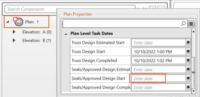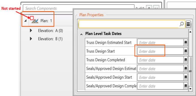 The status icon for the plan changes as the Start and Complete dates are entered for each task (assuming that the only Plan Level tasks are Truss Design and Seals Approved).